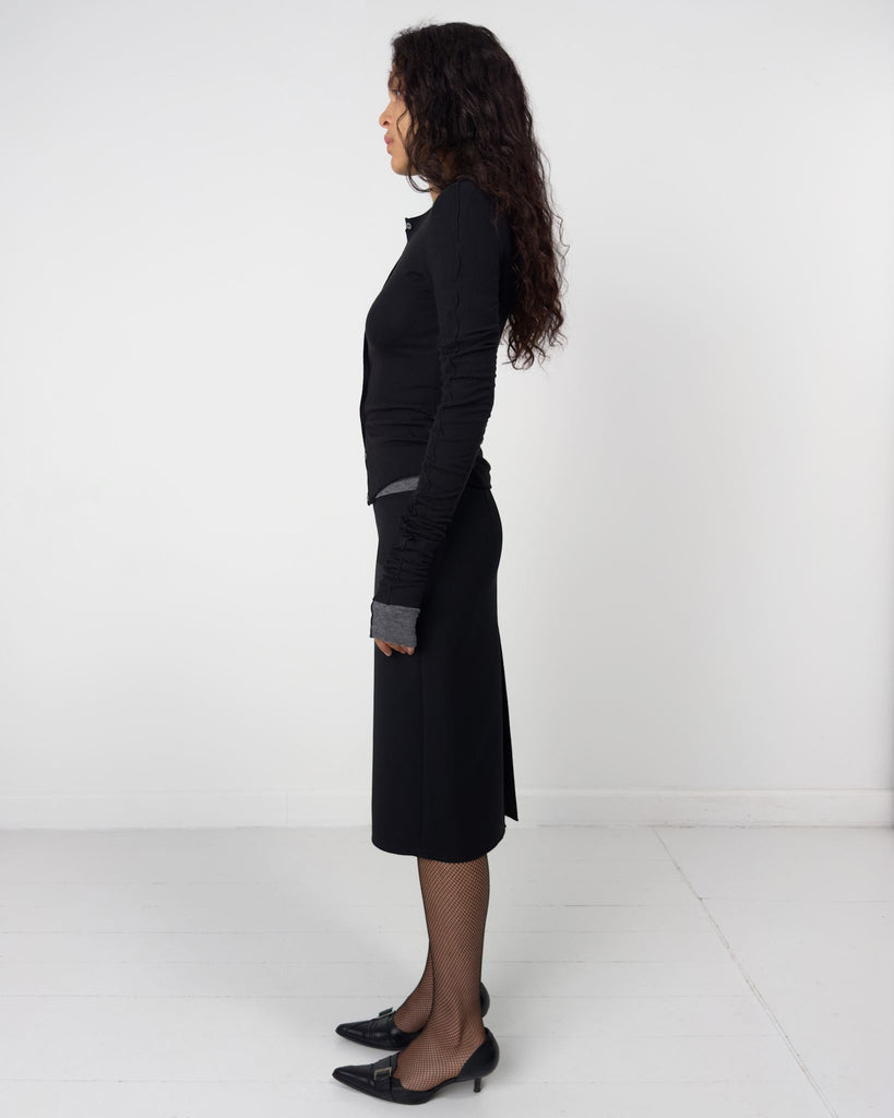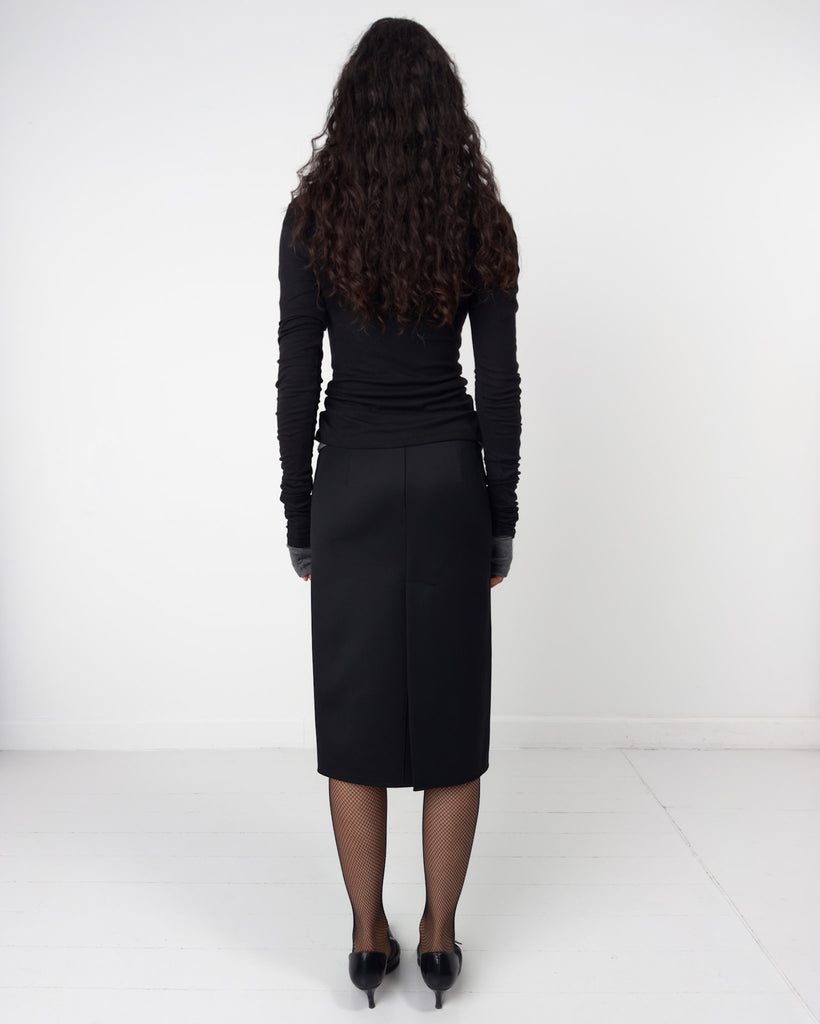 783 skirt in straight silhouette with high-rise waist, zip closure and vent at midi hemline.