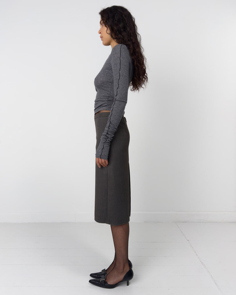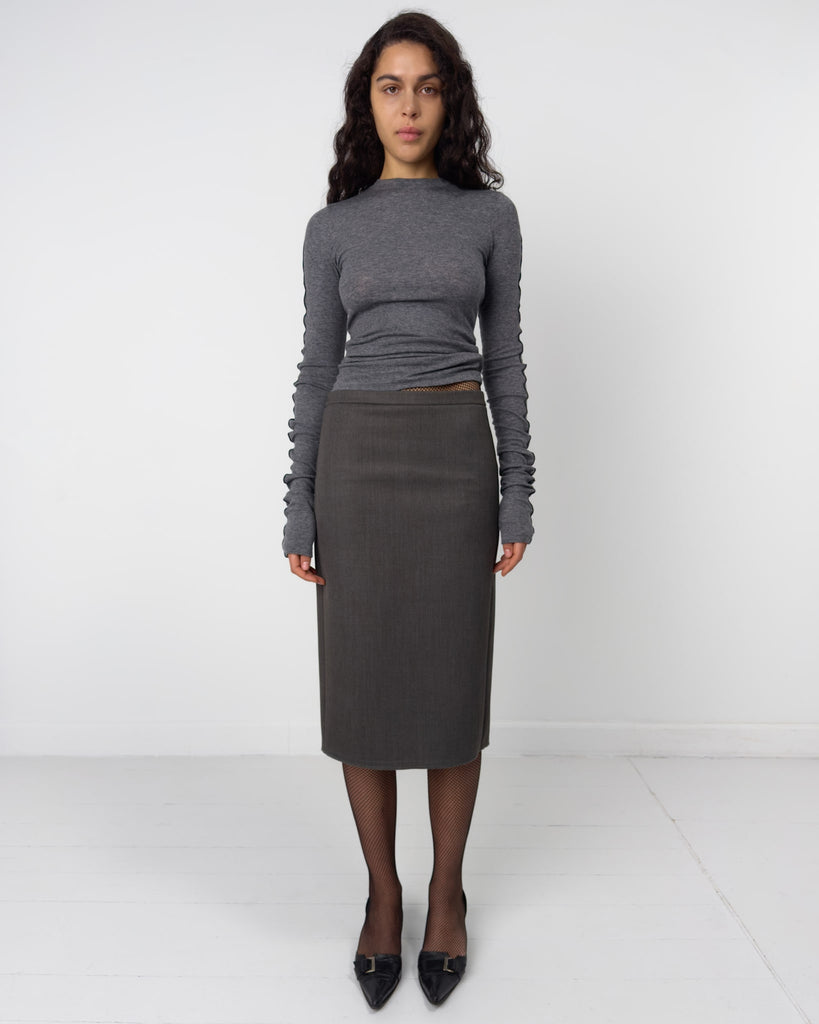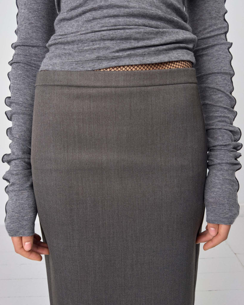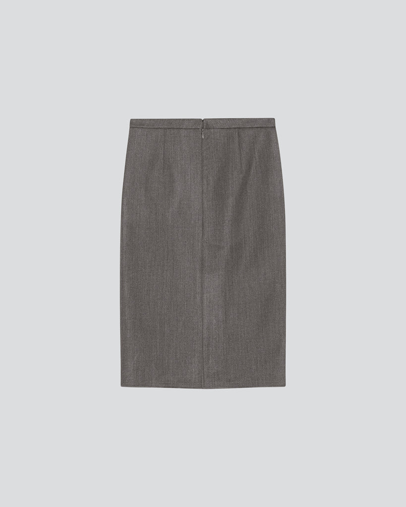 783 skirt in straight silhouette with high-rise waist, zip closure and vent at midi hemline.