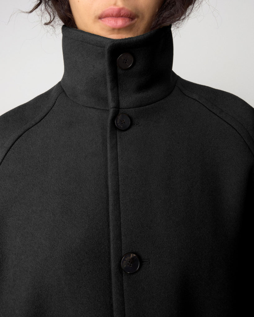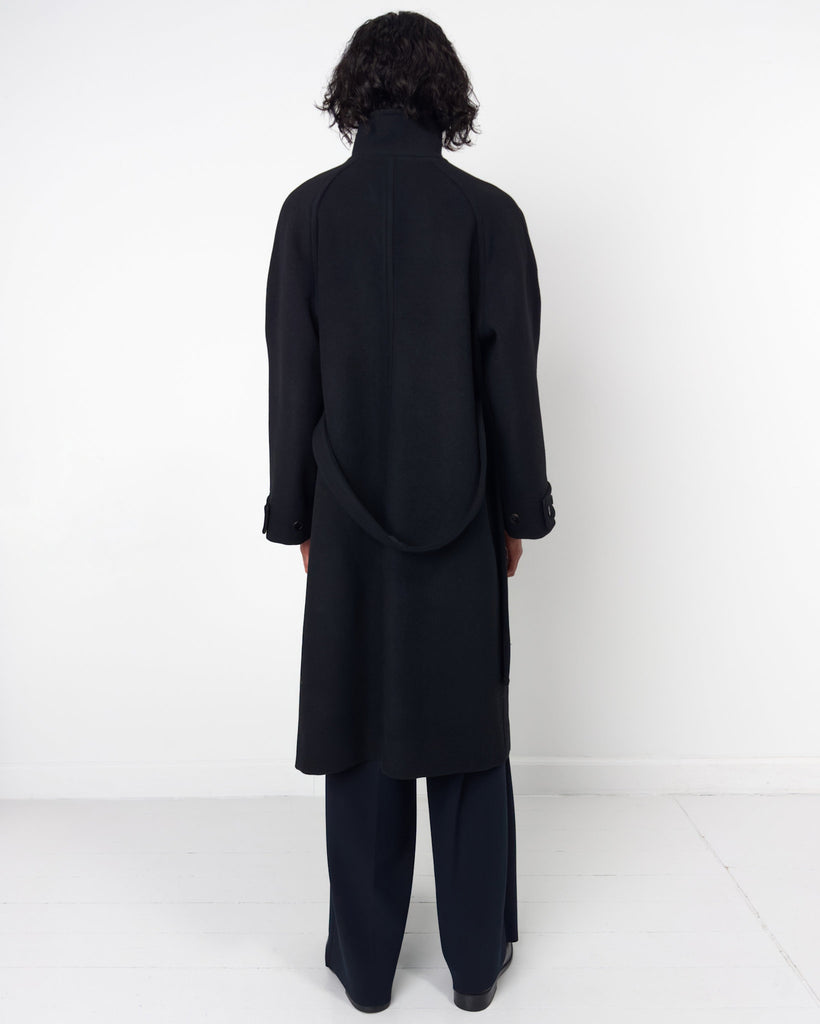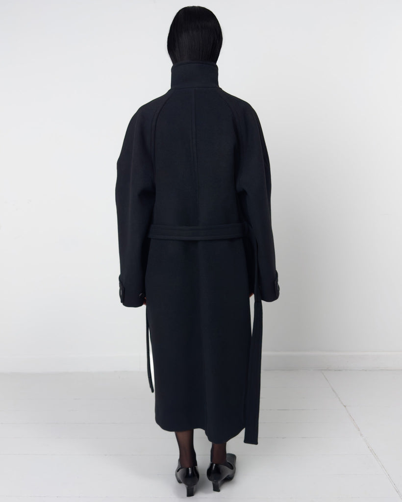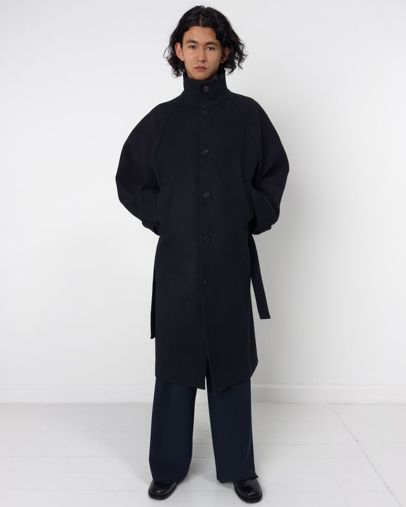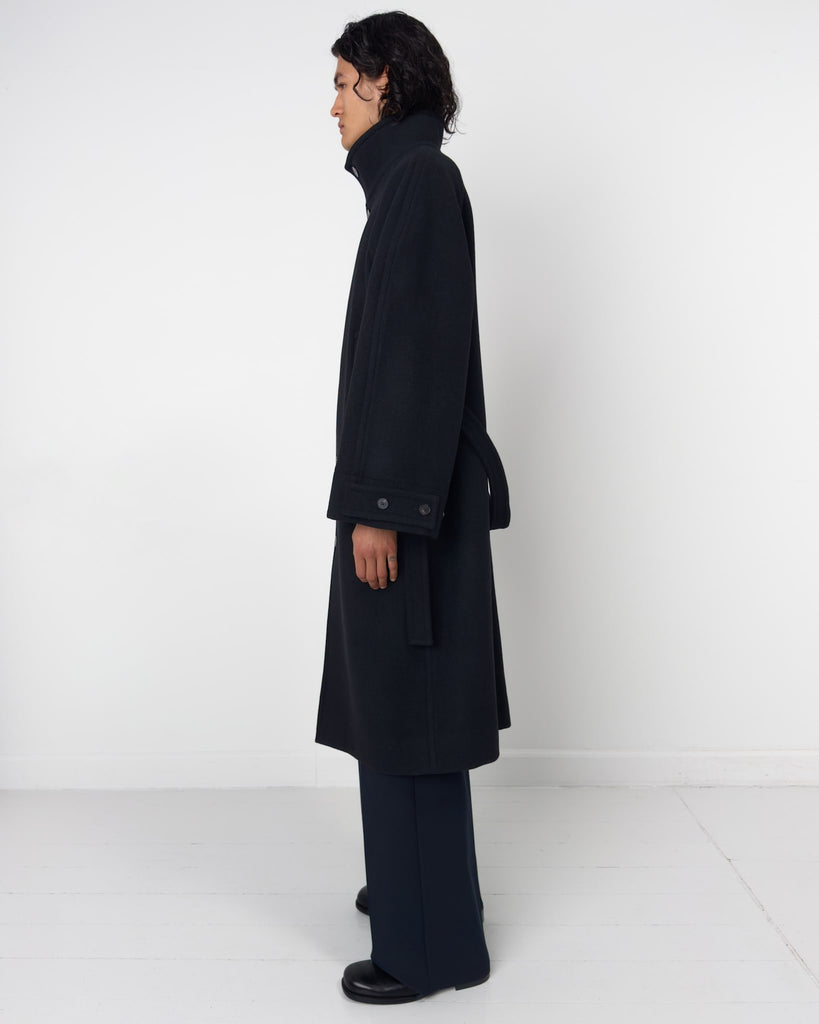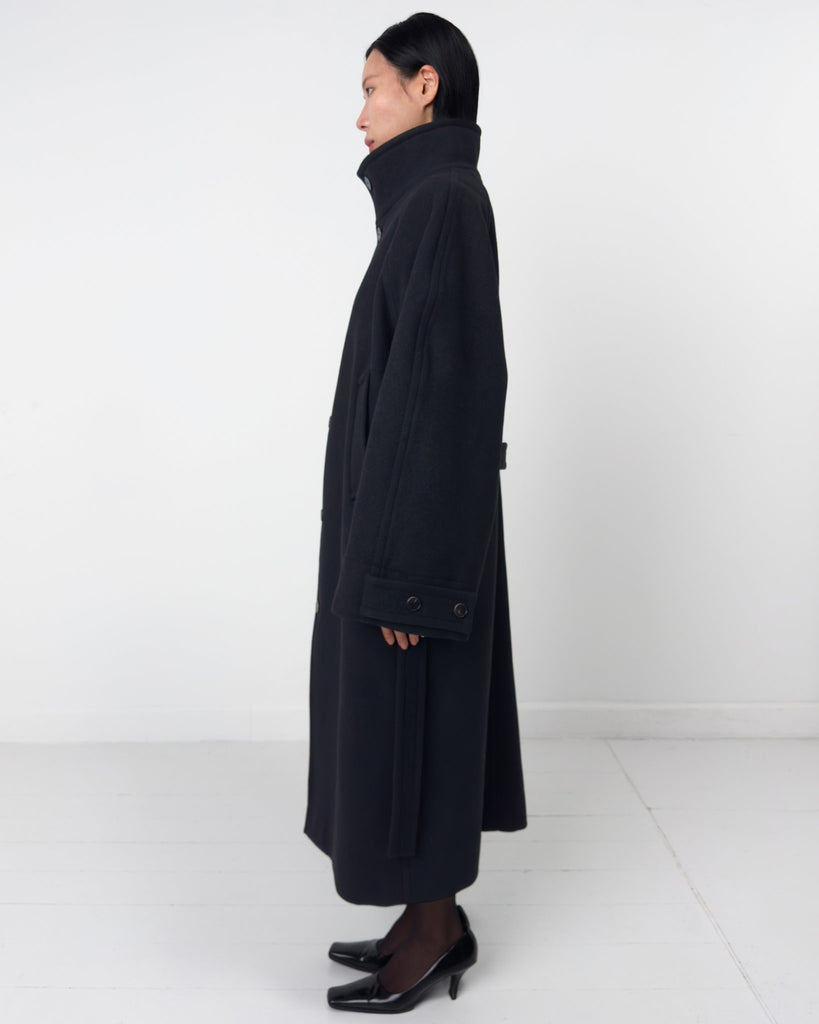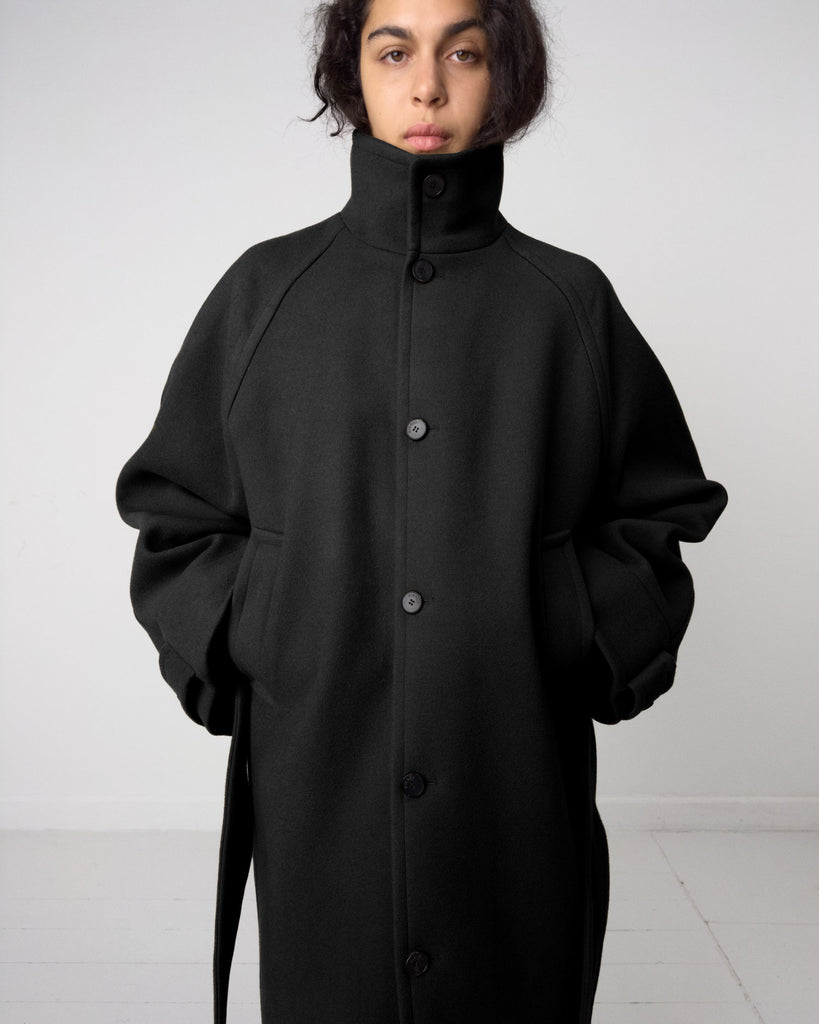 Highneck wool coat with funnel neck, raglan sleeves, welt pockets, peacoat cuffs and removable belt.