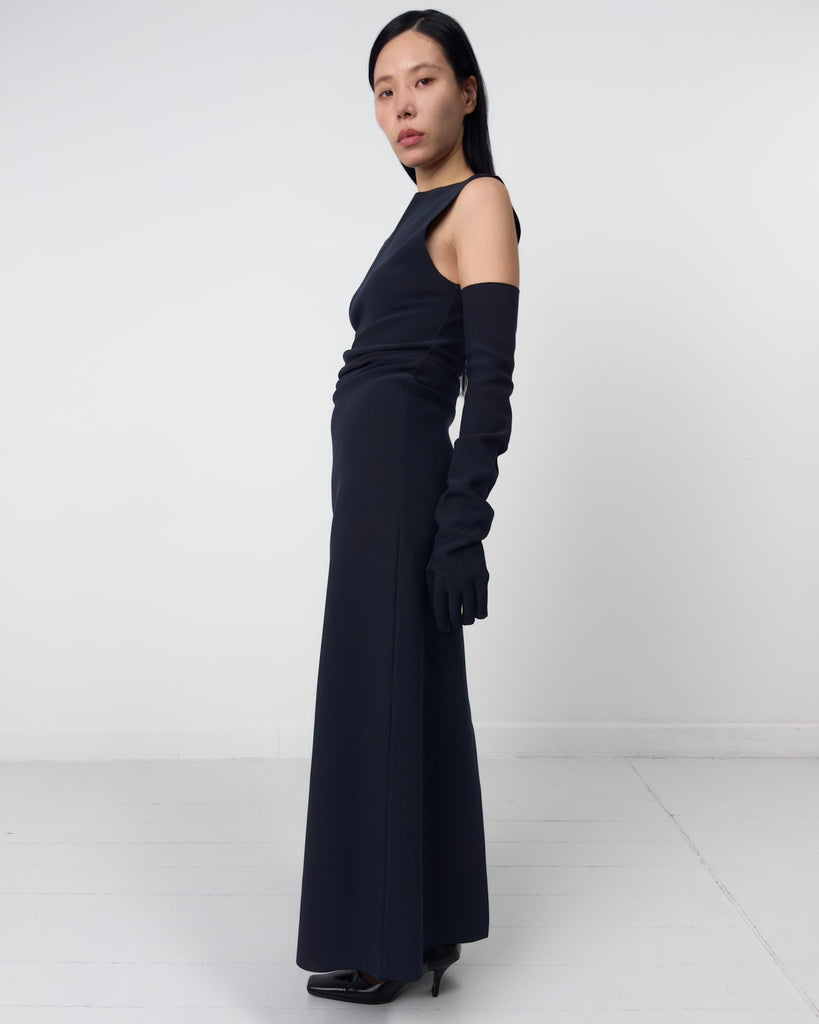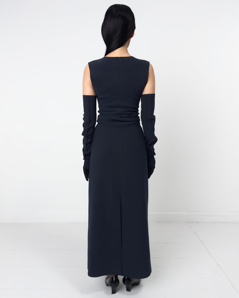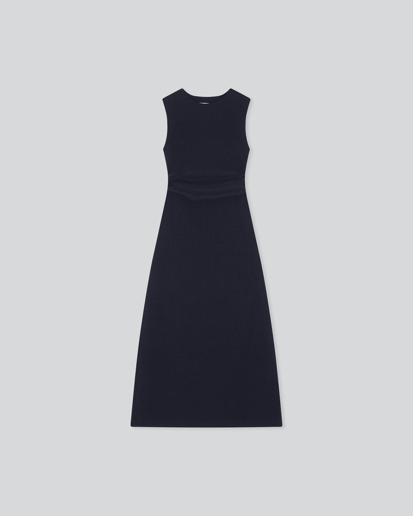 Sleeveless Lay2 Drape dress in our signature medium-weight bonded crêpe with a straight neckline, straight silhouette and maxi-length hemline. Dress is elongated to create a ruched effect at the waist.