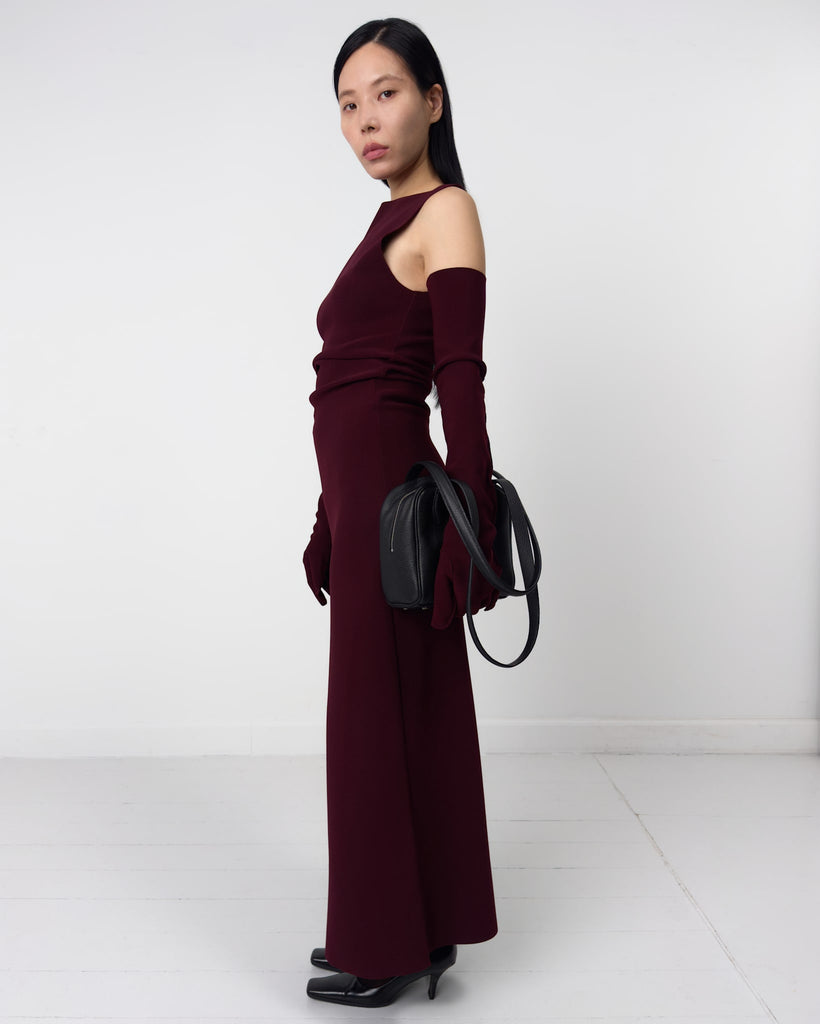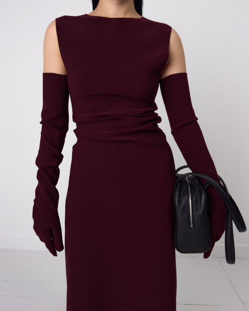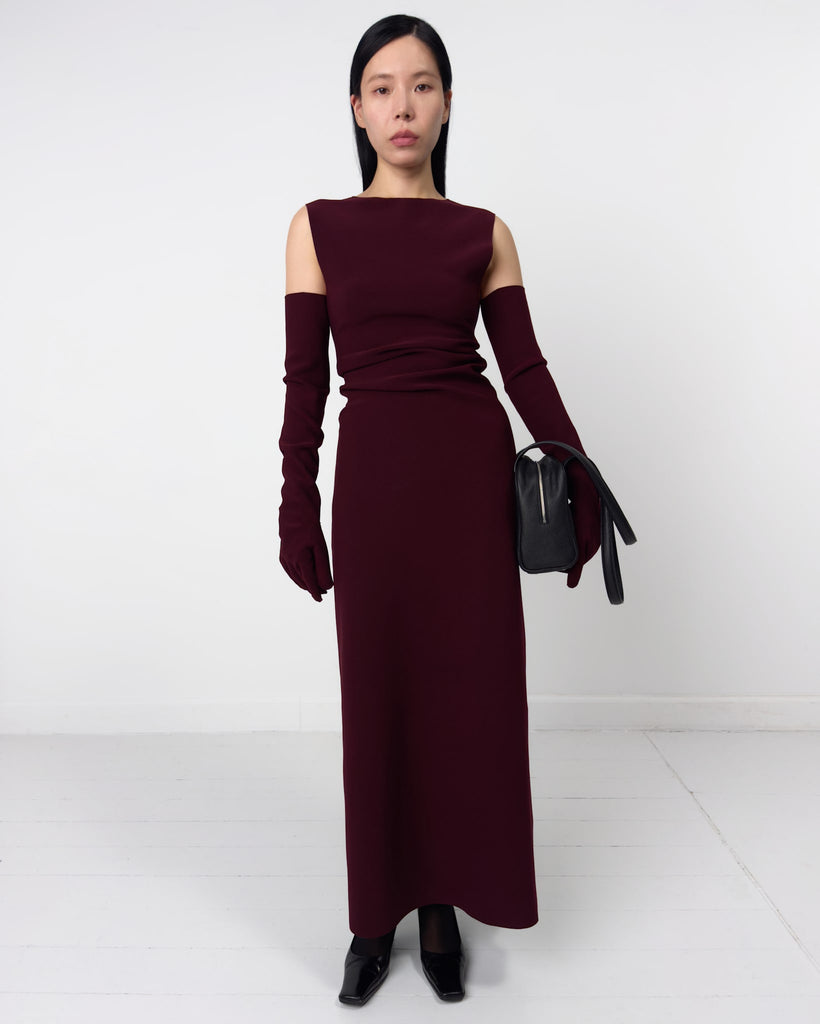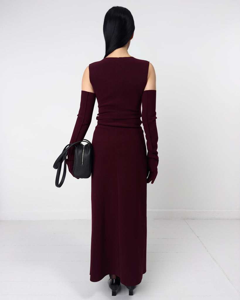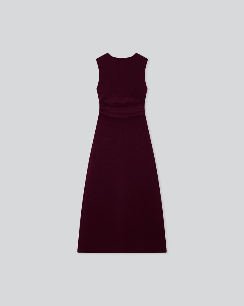 Sleeveless Lay2 Drape dress in our signature medium-weight bonded crêpe with a straight neckline, straight silhouette and maxi-length hemline. Dress is elongated to create a ruched effect at the waist.