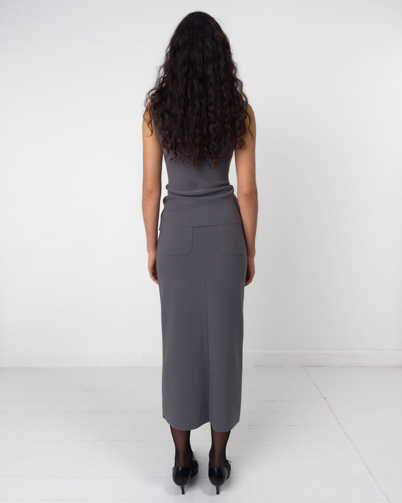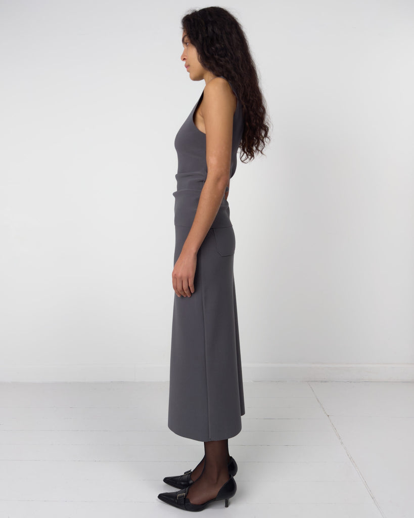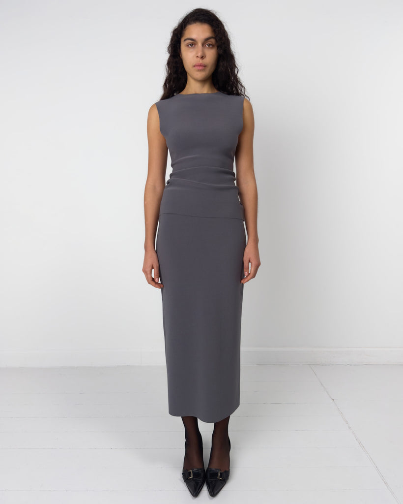 Lay2 drape top in our signature medium-weight bonded crêpe in a sleeveless silhouette and straight neckline.
