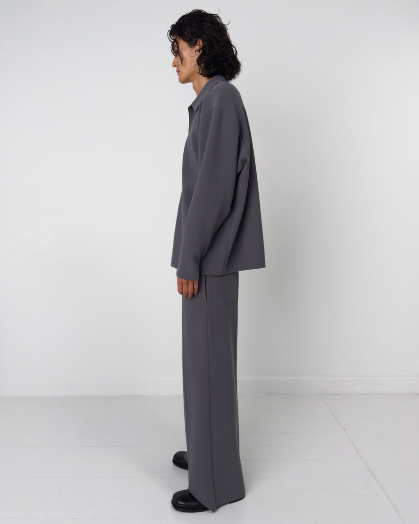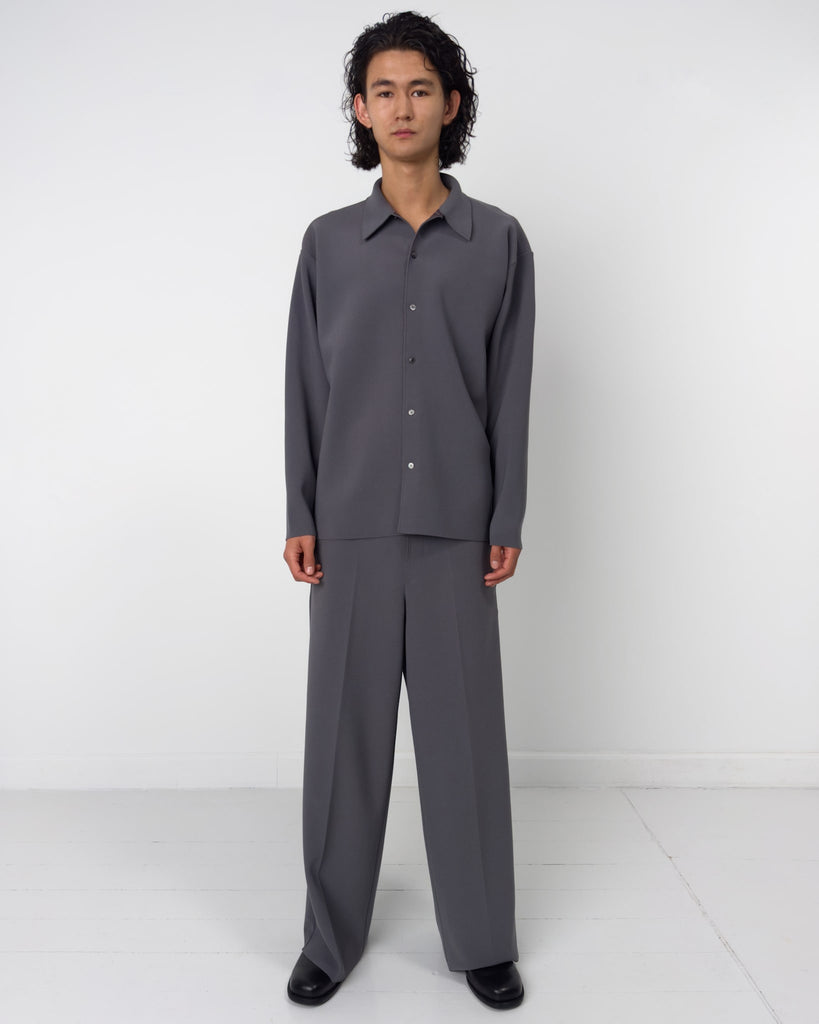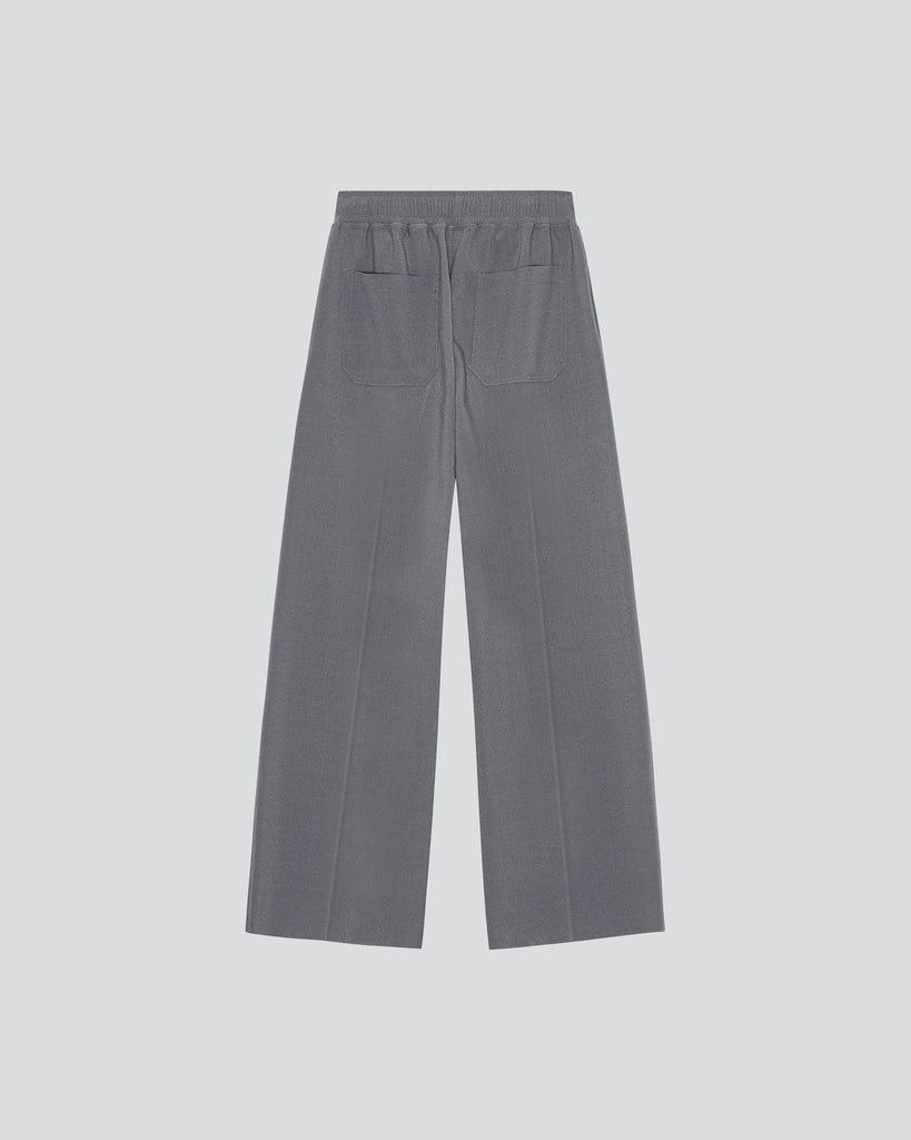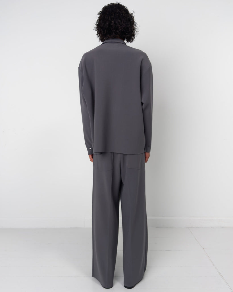 Lay2 drawstring trousers in medium-weight bonded crêpe with elasticated waistband, patch pockets at back, pressed pleats and faux fly placket. Adjustable drawstrings at inside of waistband.