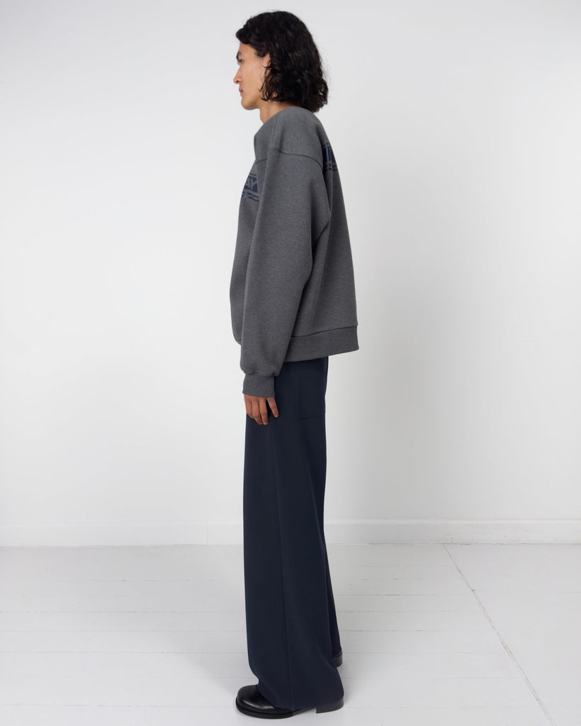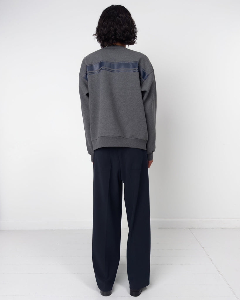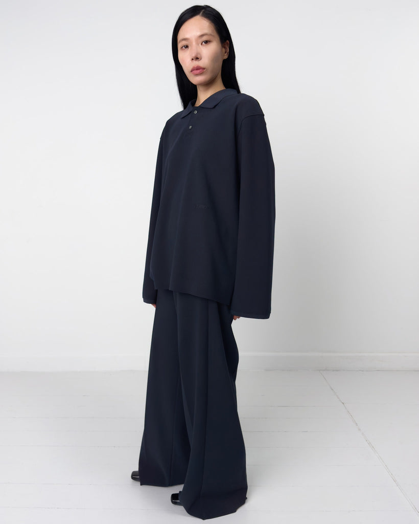 Lay2 drawstring trousers in medium-weight bonded crêpe with elasticated waistband, patch pockets at back, pressed pleats and faux fly placket. Adjustable drawstrings at inside of waistband.