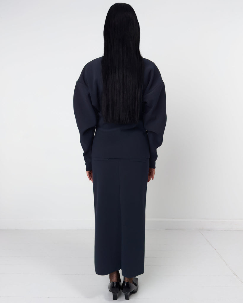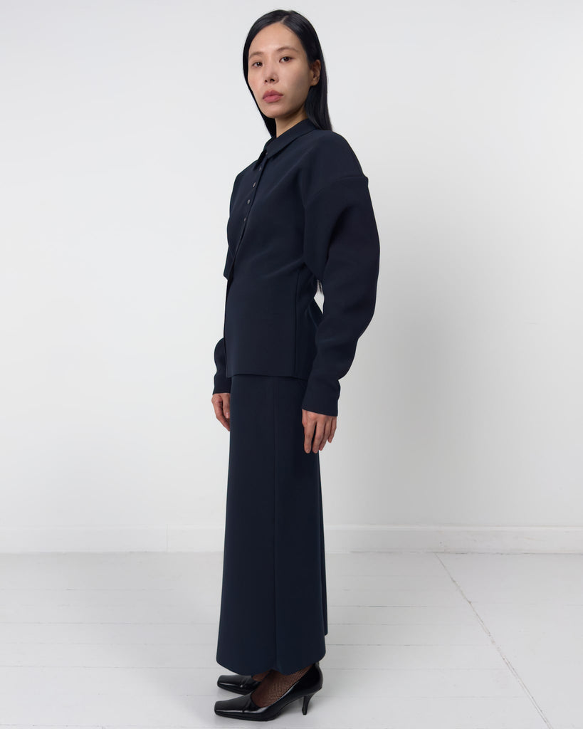 Lay3 Point Collar cardigan in our signature heavyweight bonded crêpe, with long sleeves, Boat neckline, dropped shoulders and button-down front.
