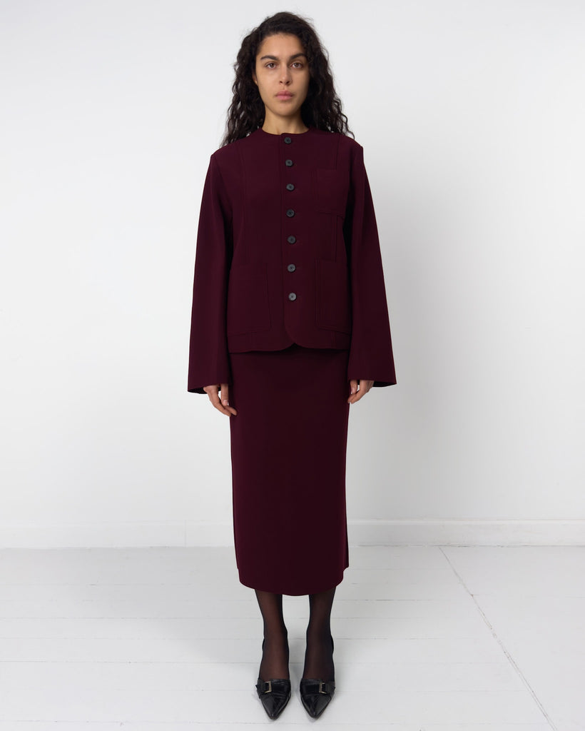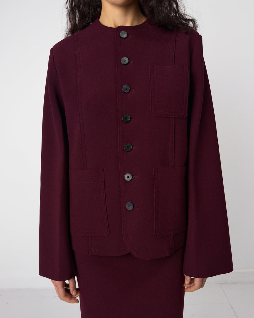 Lay4 single jacket our signature heavyweight bonded crêpe, with round collar, button-down front, wide sleeves and front patch pockets.