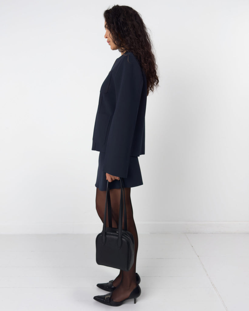 Lay4 single jacket our signature heavyweight bonded crêpe, with round collar, button-down front, wide sleeves and front patch pockets.