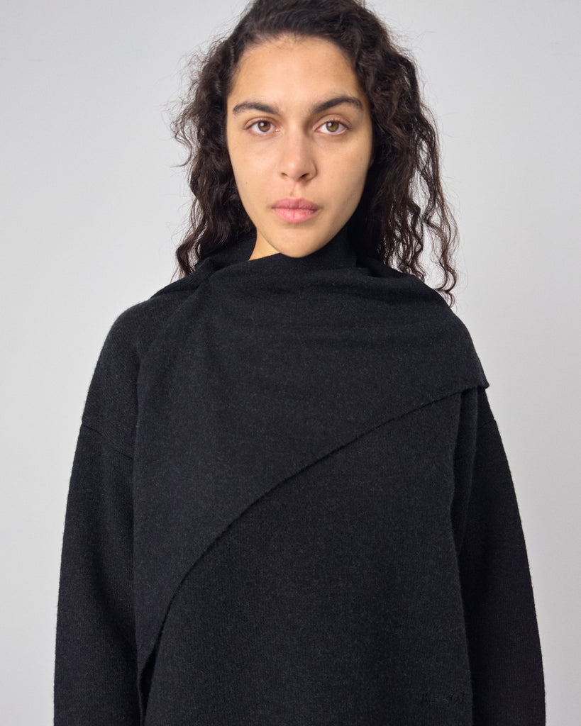 Merino knit scarf in triangle silhouette and ultra-soft handle, with single button closure and embroidery detailing.