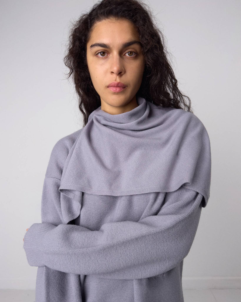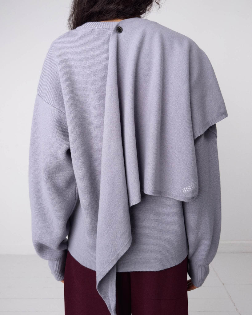 Merino knit scarf in triangle silhouette and ultra-soft handle, with single button closure and embroidery detailing.
