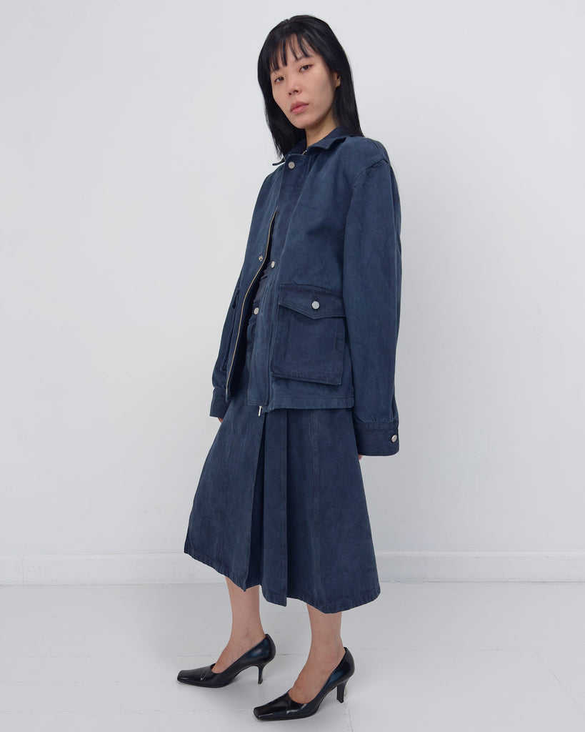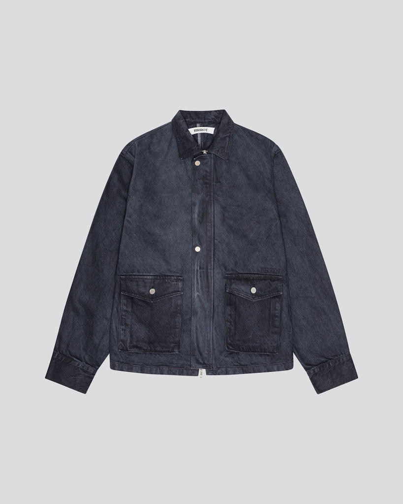 Denim work jacket in 100% cotton with sharp collar, zip and button front closure and bellow pockets in oversized silhouette.