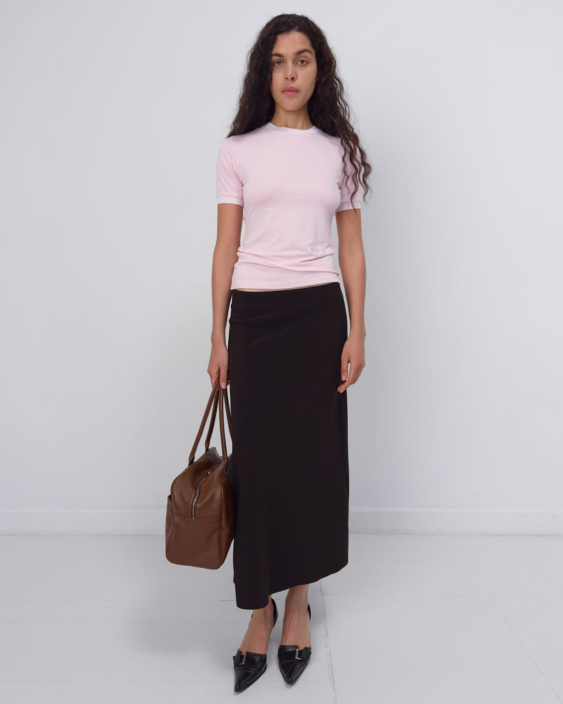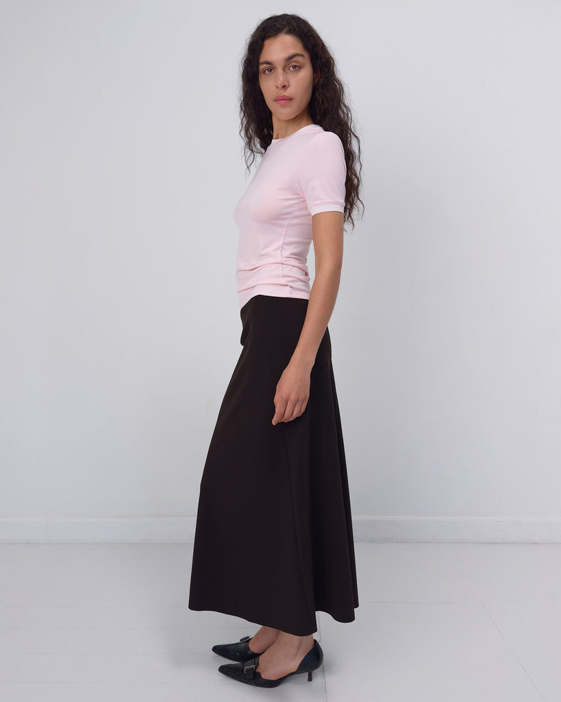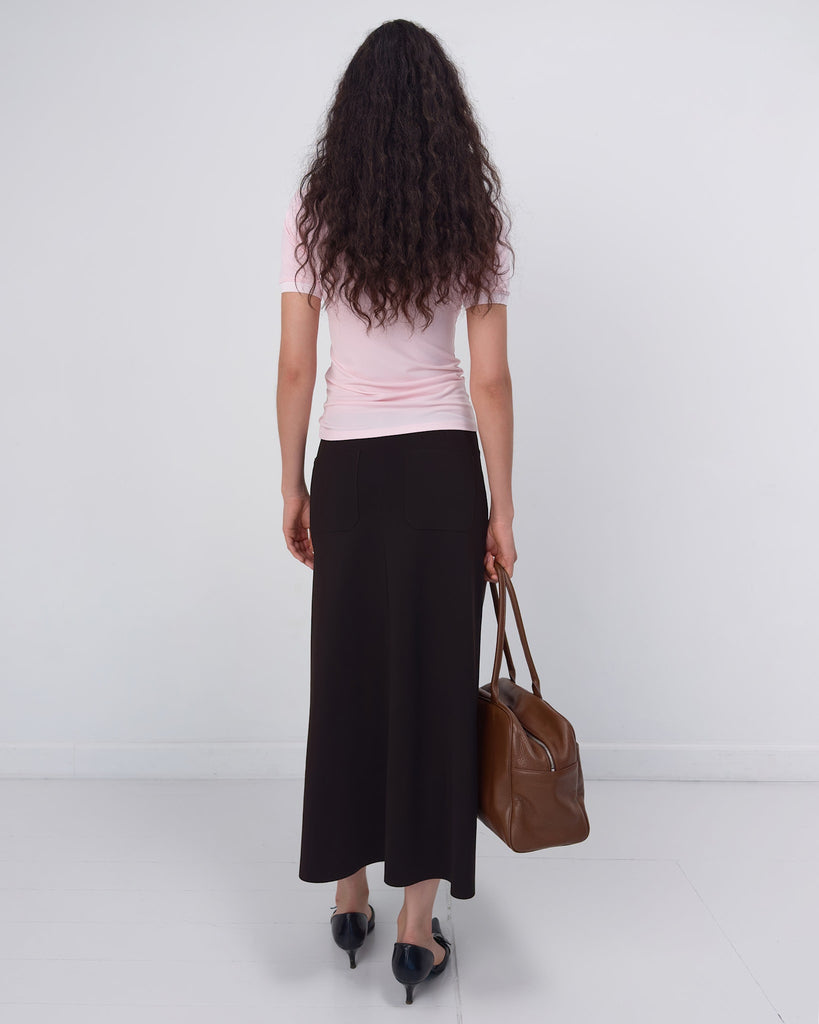 Lay2 A-line skirt in medium-weight bonded crêpe with high-rise waist and back patch pockets.