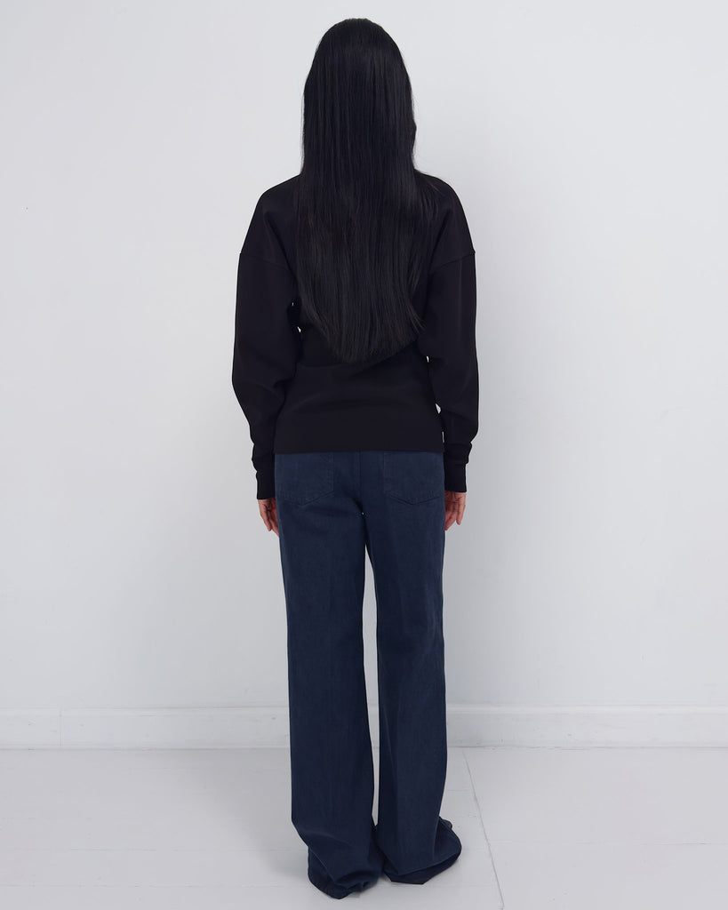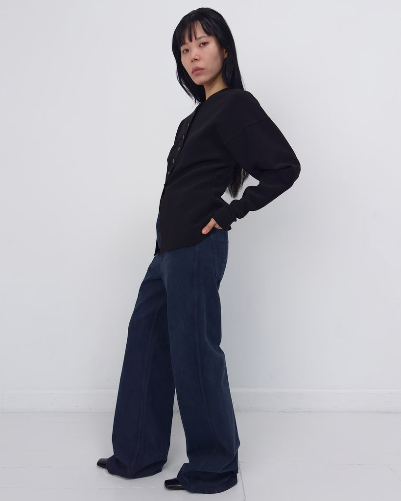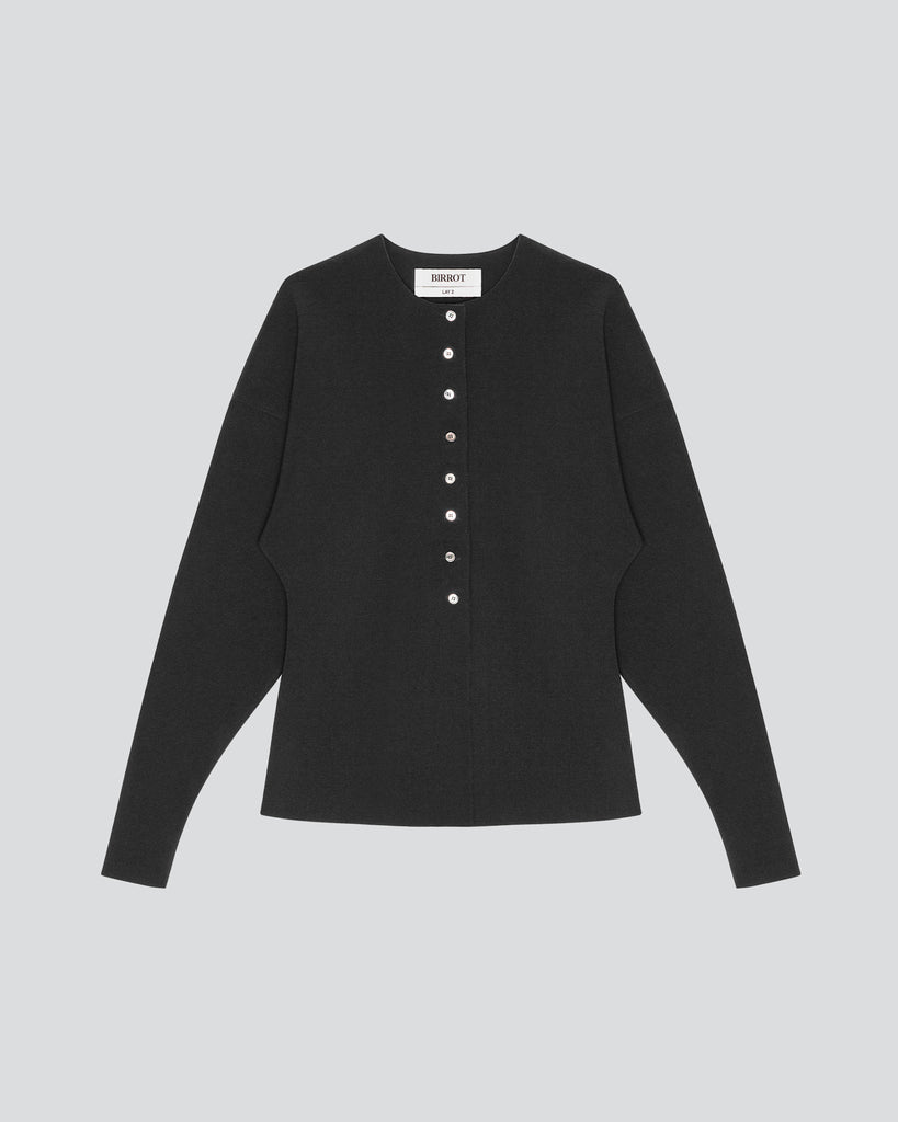 Lay2 cardigan in medium-weight bonded crêpe with straight neckline, button-down front, dropped shoulders and elongated sleeves.