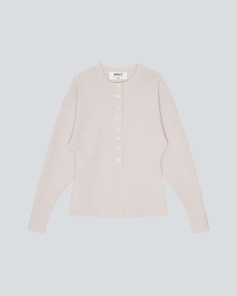 Lay2 cardigan in medium-weight bonded crêpe with straight neckline, button-down front, dropped shoulders and elongated sleeves.
