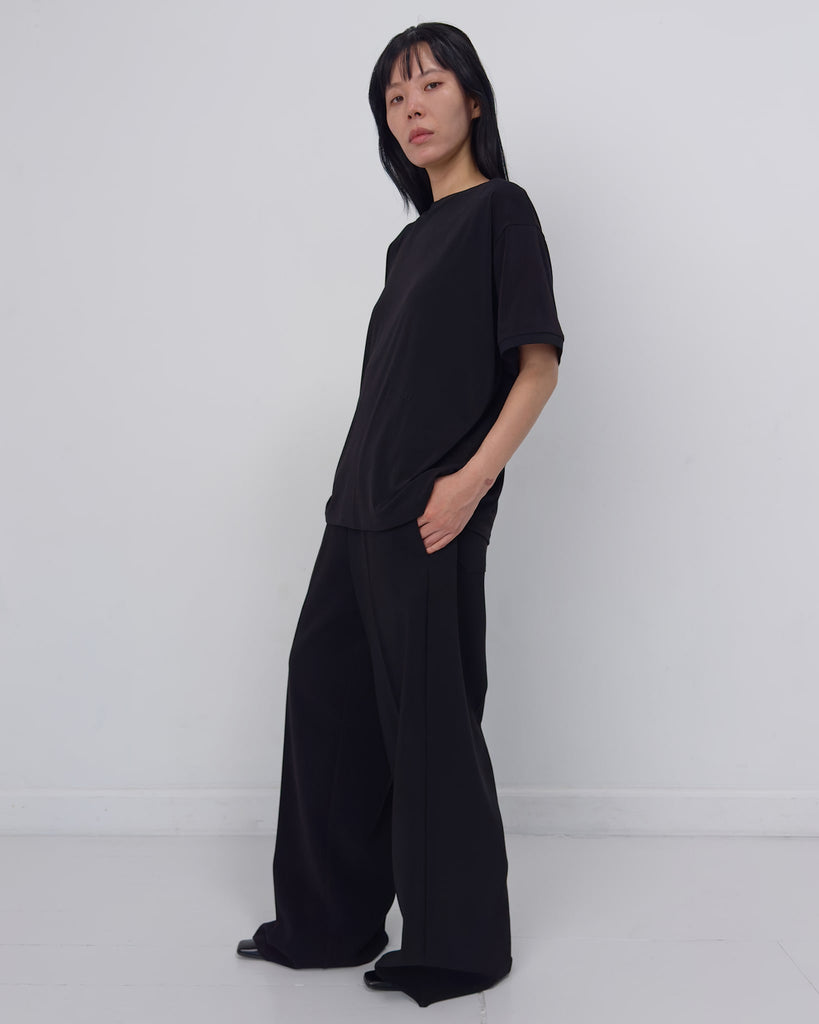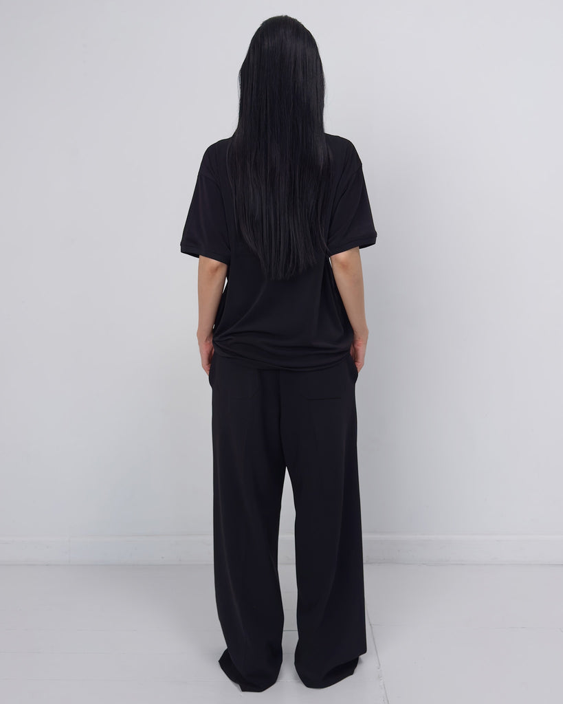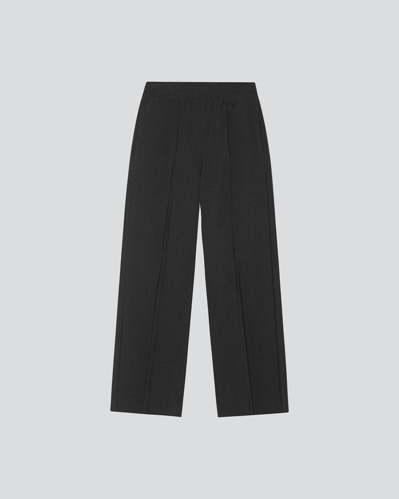 Lay2 trousers in heavyweight bonded crêpe with elasticated waistband, adjustable drawstrings, side slit pockets, back patch pockets, wide legs and pressed creases.