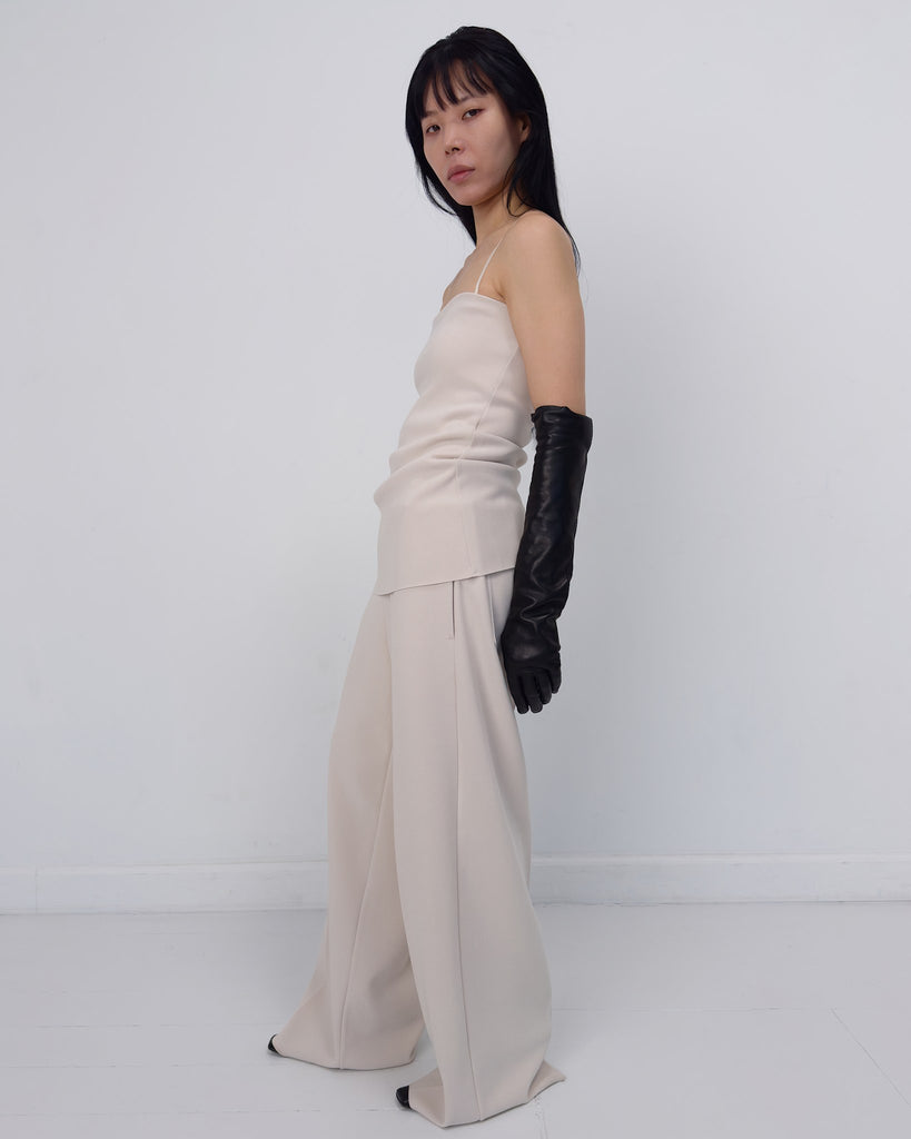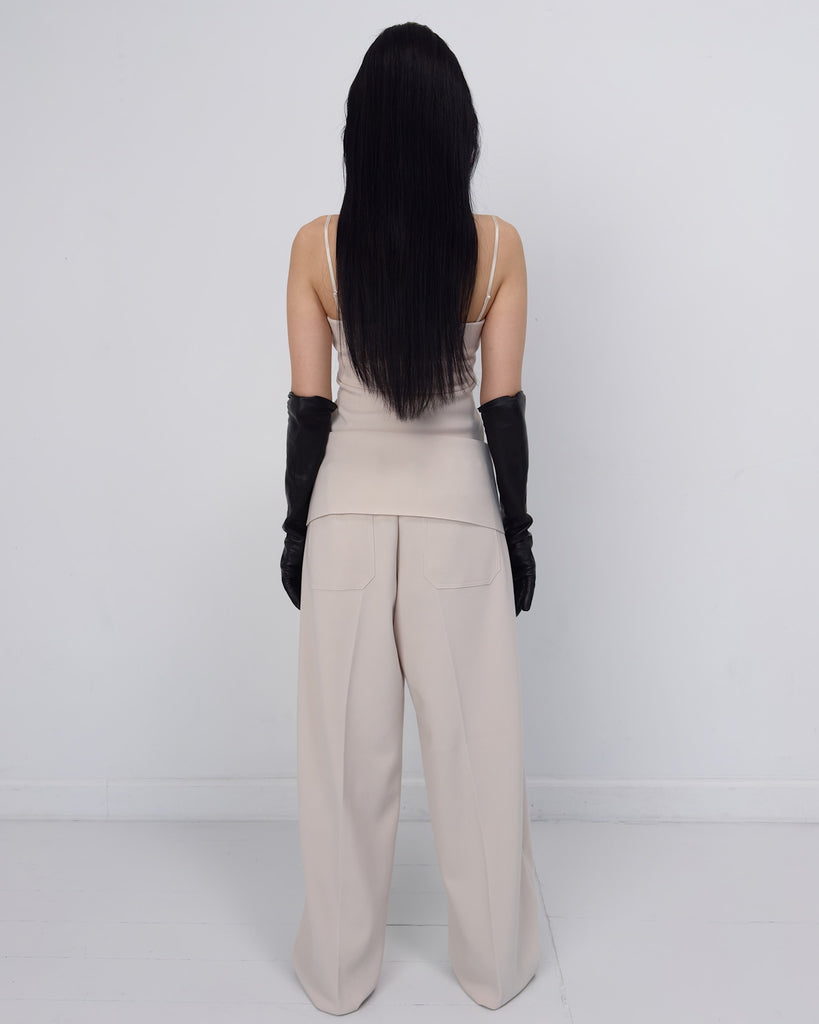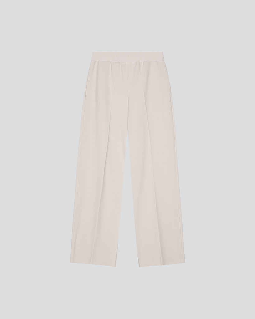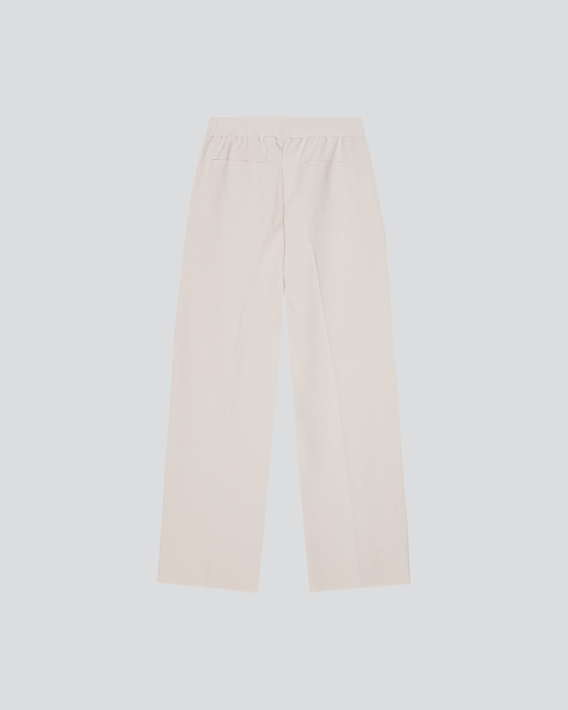 Lay2 trousers in heavyweight bonded crêpe with elasticated waistband, adjustable drawstrings, side slit pockets, back patch pockets, wide legs and pressed creases.