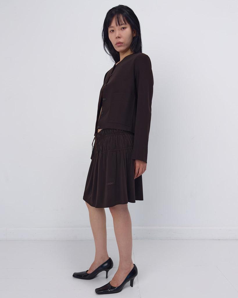 Lay2 Jacket in medium-weight bonded crêpe with straight neckline, dropped shoulders, long sleeves, button-down front, front patch pockets, back vent and fitted silhouette.
