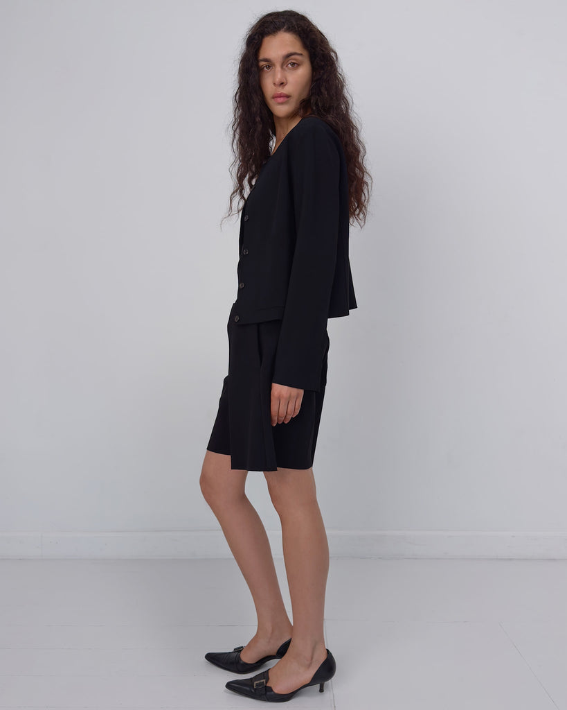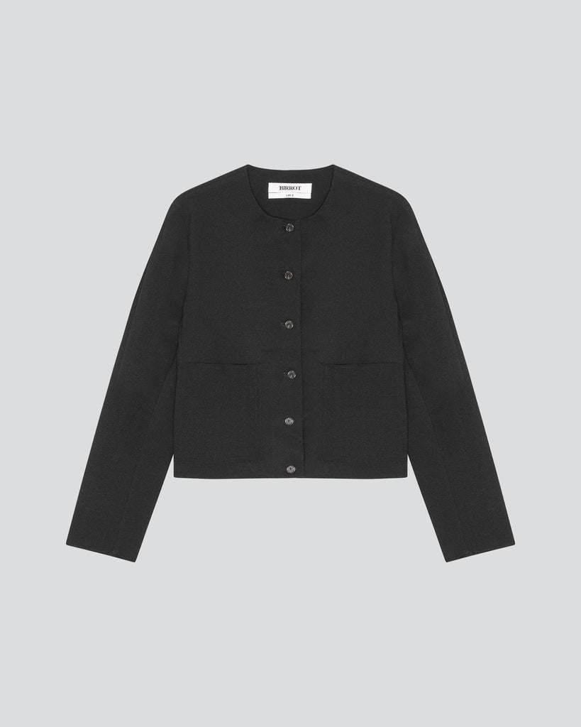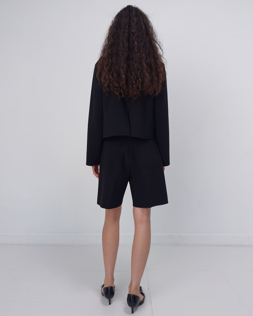 Lay2 Jacket in medium-weight bonded crêpe with straight neckline, dropped shoulders, long sleeves, button-down front, front patch pockets, back vent and fitted silhouette.