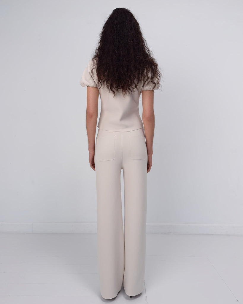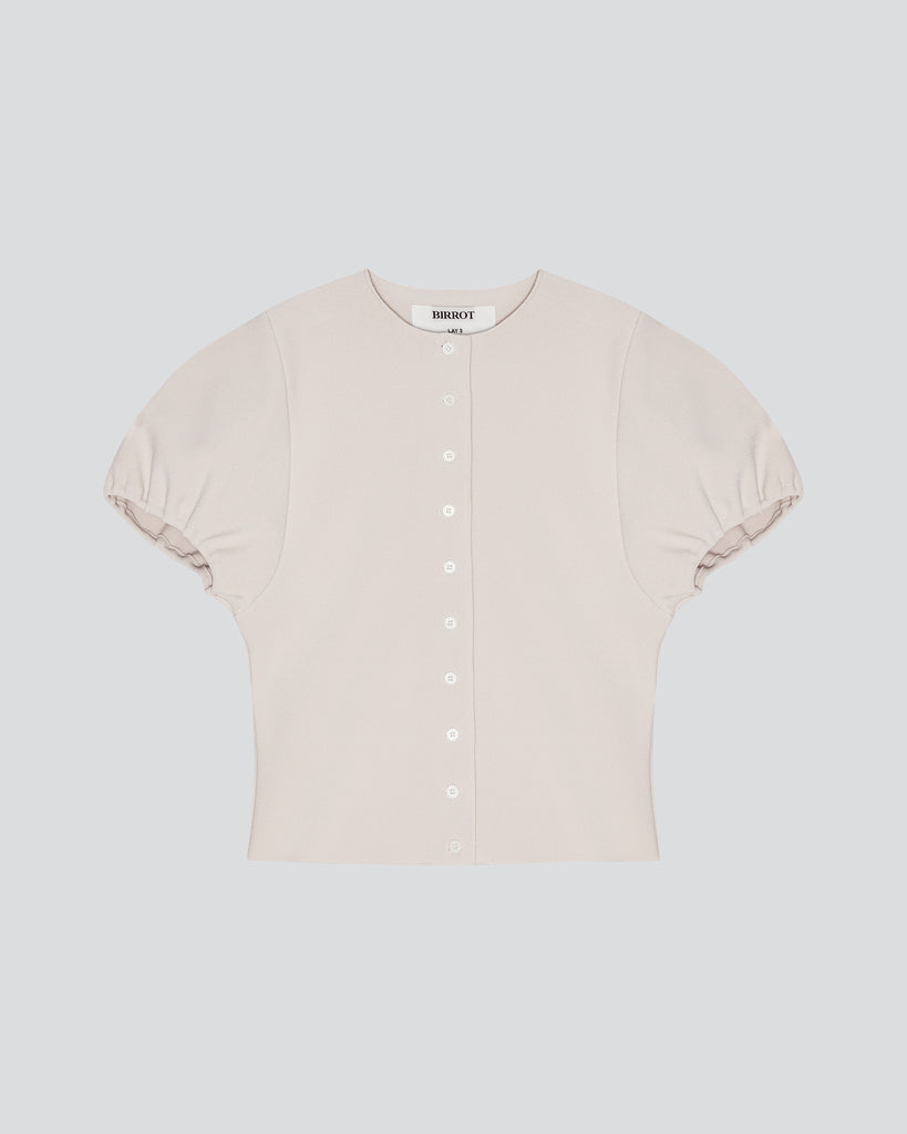 Lay3 blouse in heavyweight bonded crêpe with round neckline, cropped, elasticated sleeves, button-down front and fitted silhouette.