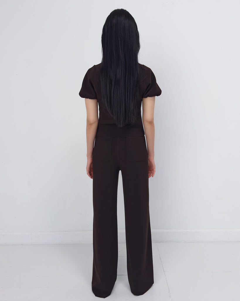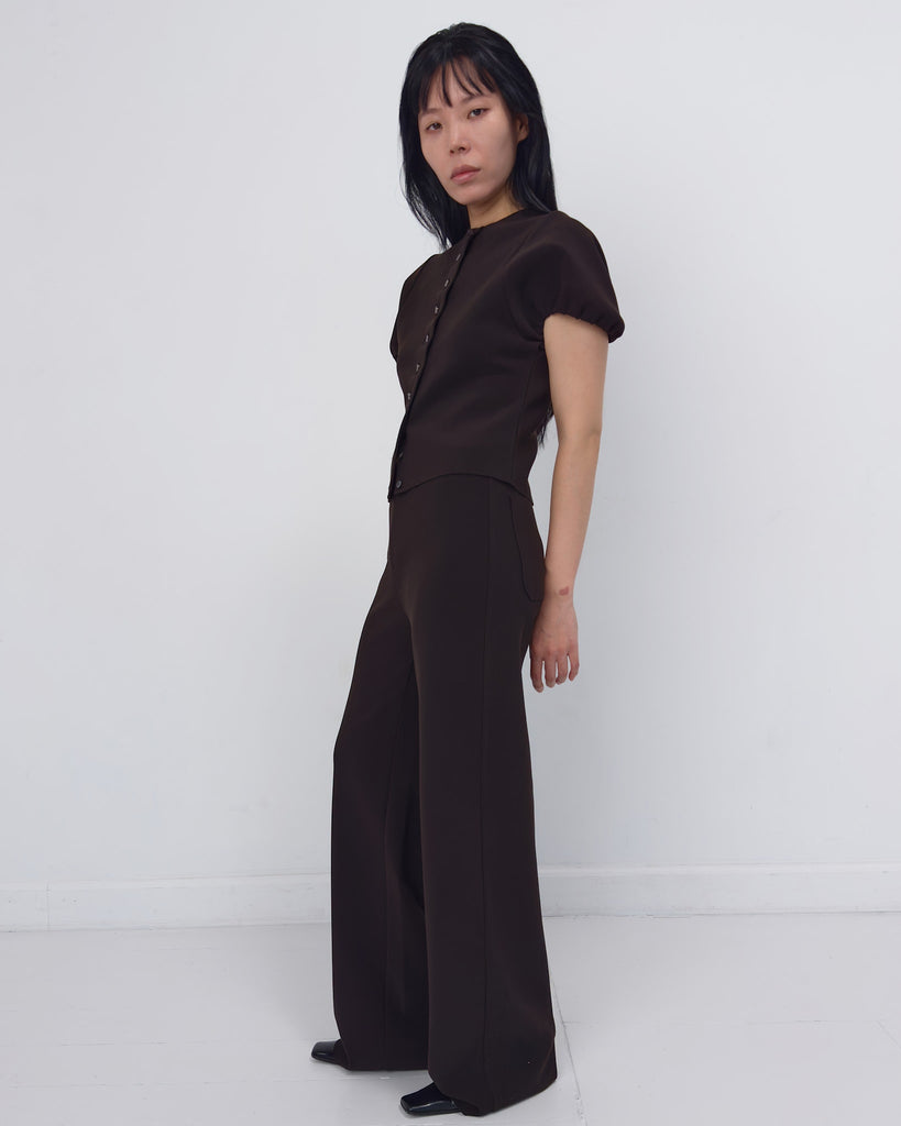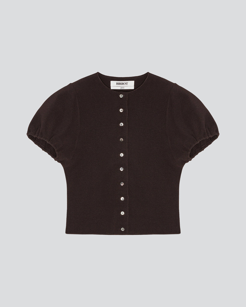Lay3 blouse in heavyweight bonded crêpe with round neckline, cropped, elasticated sleeves, button-down front and fitted silhouette.