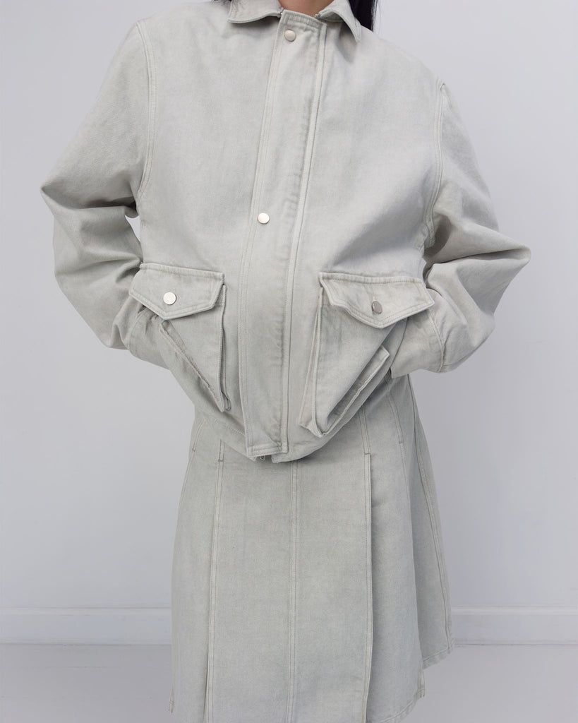 Denim work jacket in 100% cotton with sharp collar, zip and button front closure and bellow pockets in oversized silhouette.
