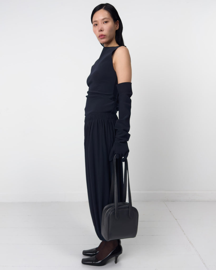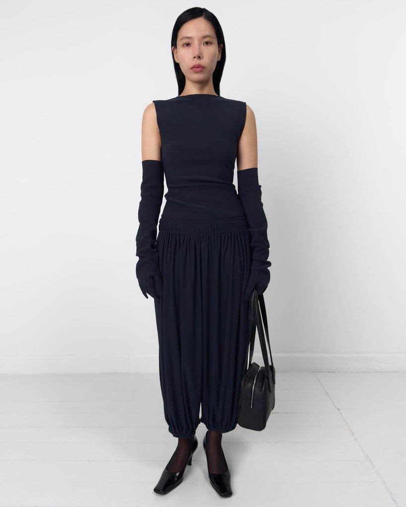 Lay2 drape top in our signature medium-weight bonded crêpe in a sleeveless silhouette and straight neckline.